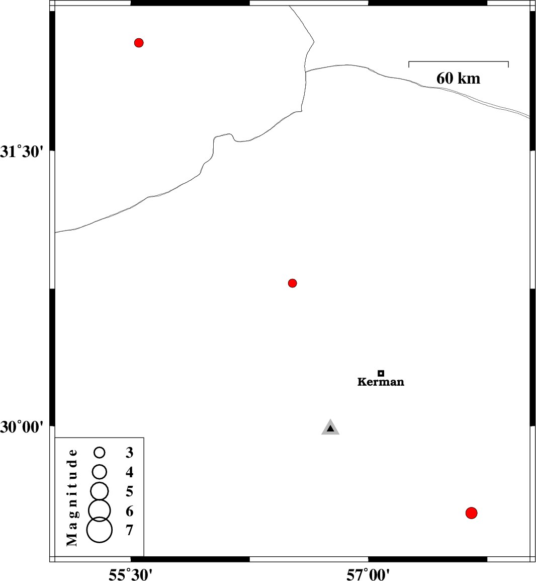 | 2013/01/14 | 05:07:27.0 | 08:37:27.0 | 29.52 | 57.65 | 14 | ML3.2 | Kerman Province, 95 km North of Jiroft |