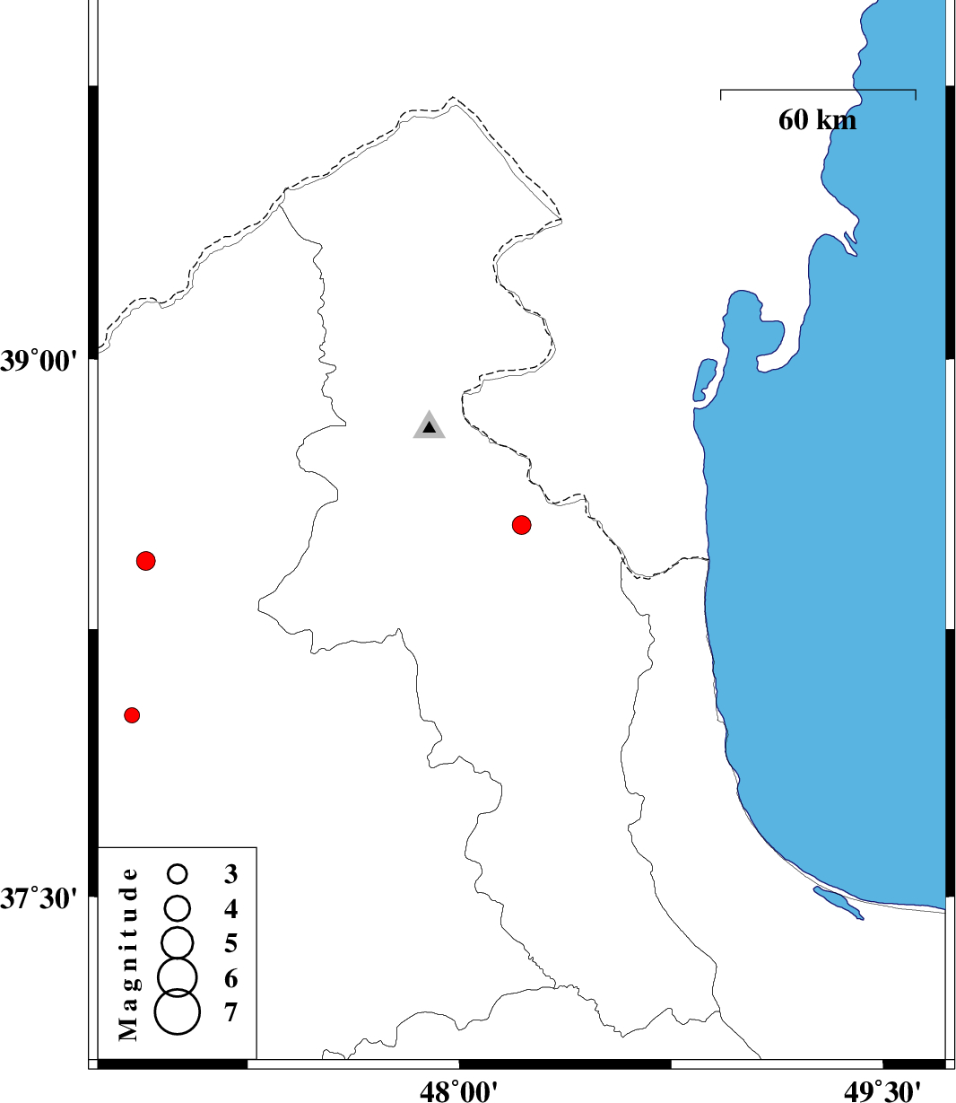 | 2013/01/10 | 22:23:47.3 | 01:53:47.3 | 38.44 | 46.89 | 18 | ML3 | Azarbaijan Sharghi Province, 17 km West of Ahar |