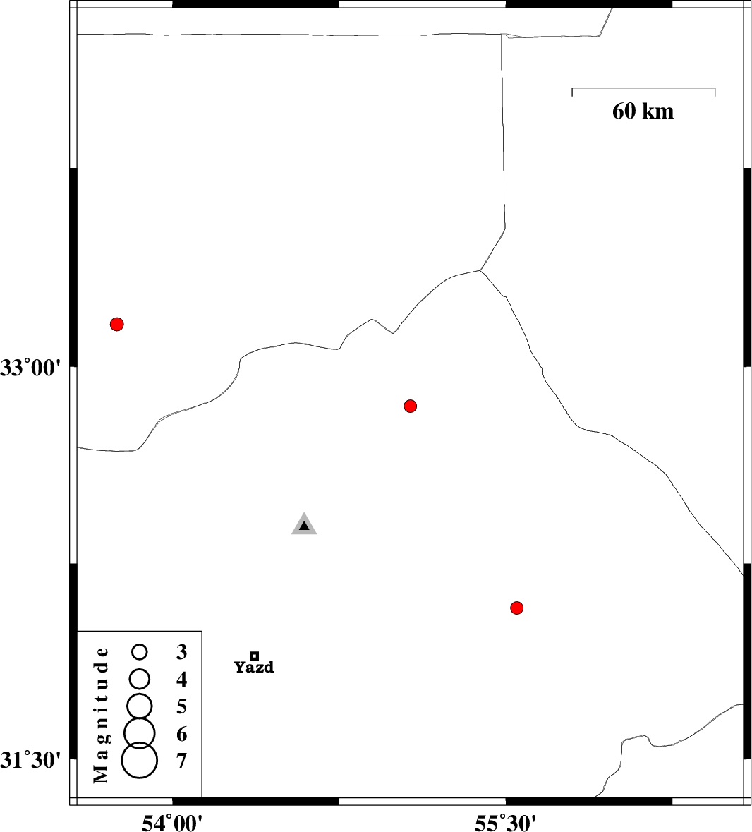 | 2013/01/22 | 07:40:43.3 | 11:10:43.3 | 32.85 | 55.07 | 14 | ML2.6 | Yazd Province, 142 km North-West of Bafq | ||