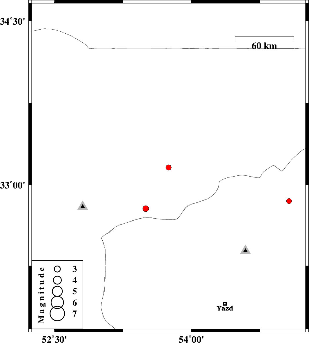 | 2013/01/01 | 16:41:51.8 | 20:11:51.8 | 32.78 | 53.5 | 14 | ML3 | Esfahan Province, 39 km East of Nain |