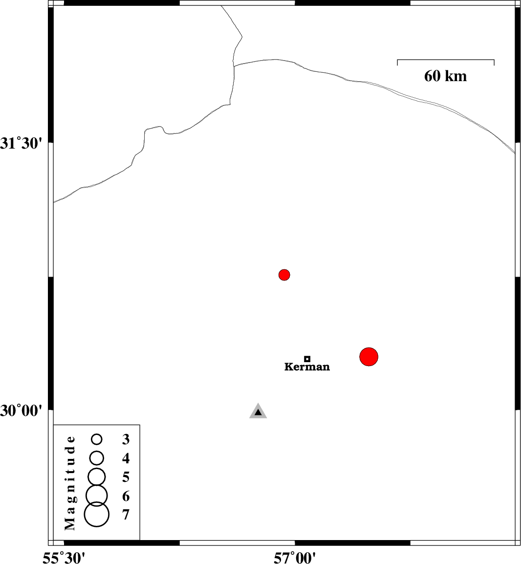 | 2013/01/21 | 19:48:58.5 | 23:18:58.5 | 30.3 | 57.48 | 28 | ML5.3 | Kerman Province, 39 km East of Kerman |