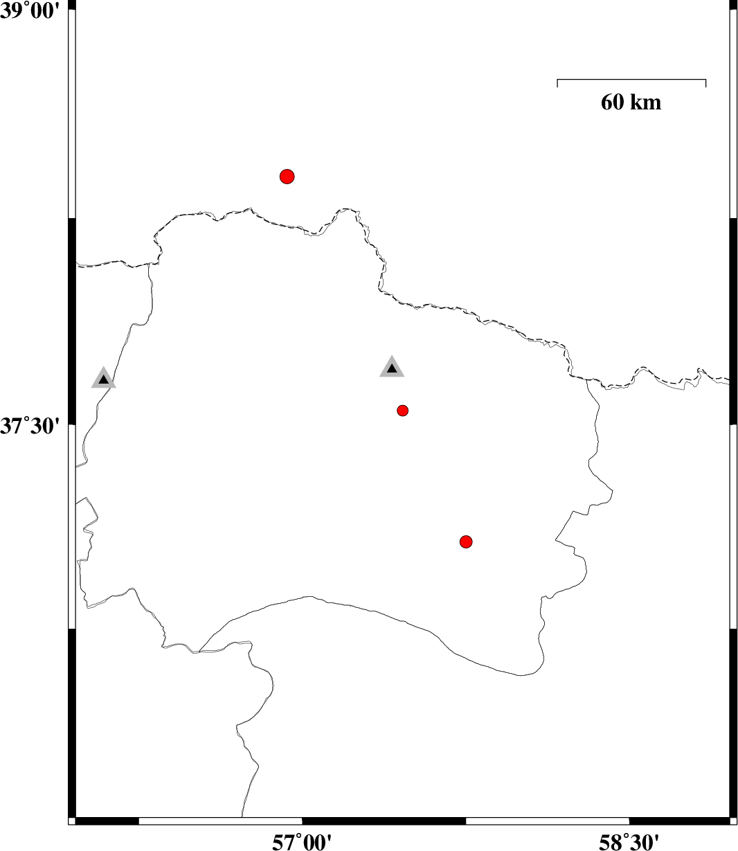 | 2013/02/01 | 20:05:44.3 | 23:35:44.3 | 37.55 | 57.46 | 35 | ML2.3 | Khorasan(north) Province, 14 km East of Bojnurd | ||