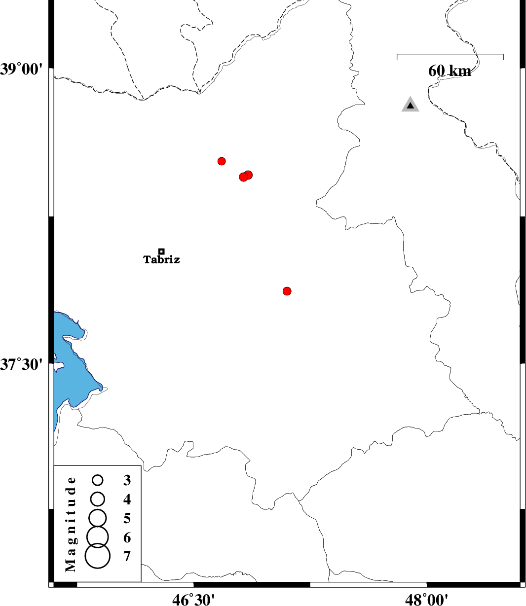 | 2013/02/08 | 19:25:57.1 | 22:55:57.1 | 37.87 | 47.1 | 14 | ML2.4 | Azarbaijan Sharghi Province, 23 km East of Bostanabad | ||