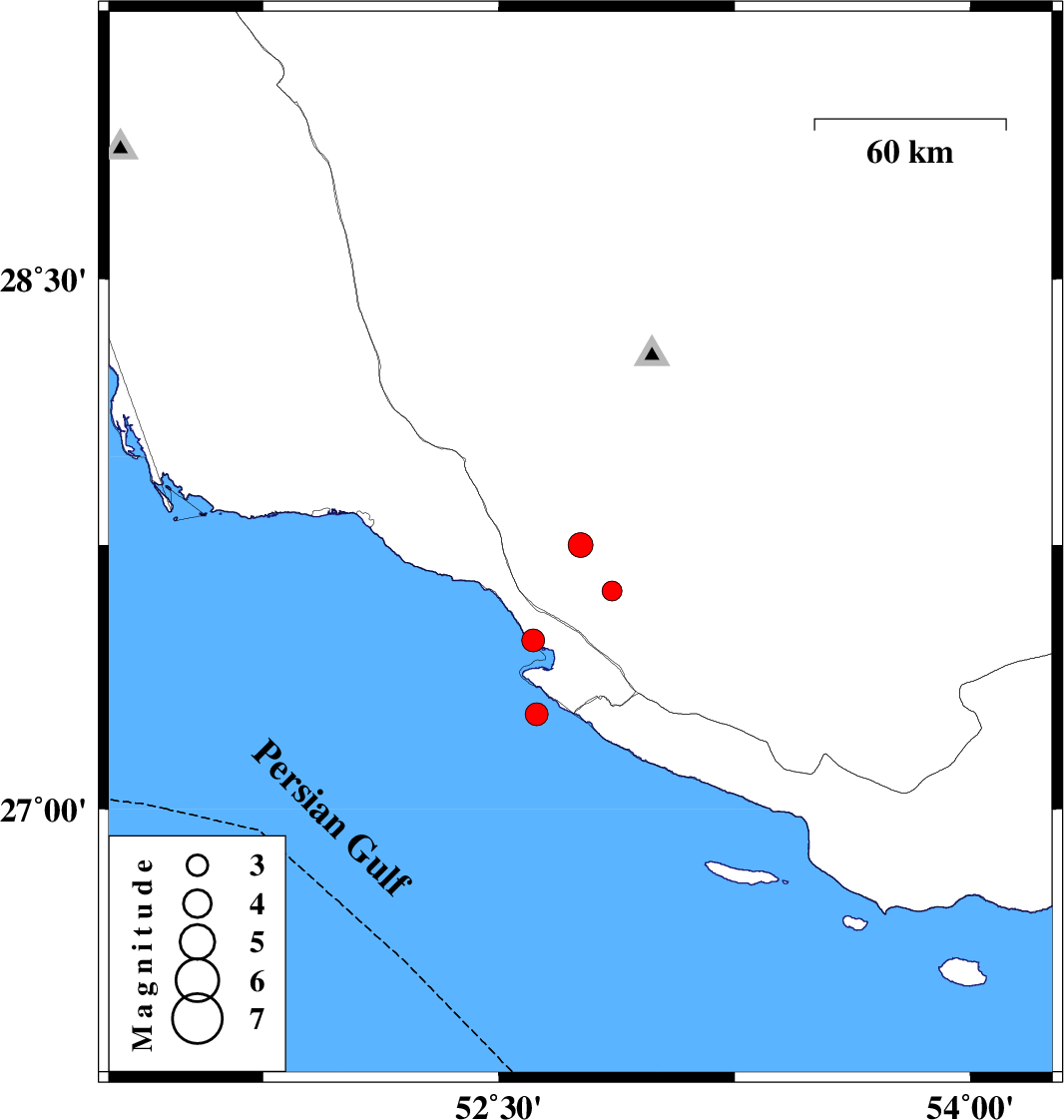 | 2013/02/09 | 19:23:50.7 | 22:53:50.7 | 27.27 | 52.62 | 14 | ML3.2 | Persian Gulf, 41 km South-West of Mehr | ||