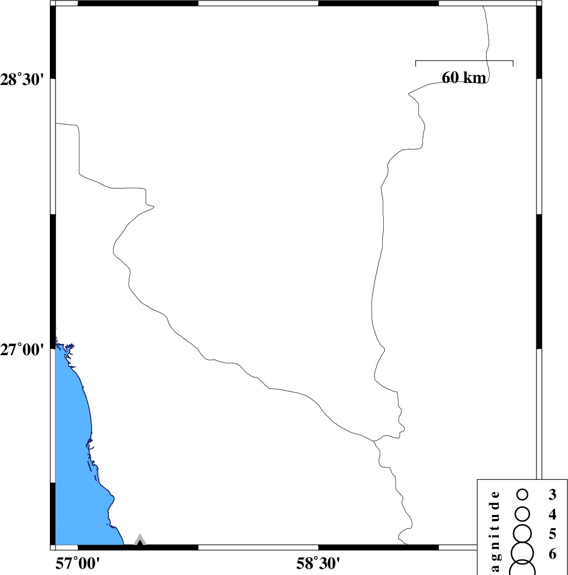 | 2013/02/11 | 01:19:37.8 | 04:49:37.8 | 27.4 | 58.36 | 33 | ML3.4 | Kerman Province, 85 km East of Manujan |