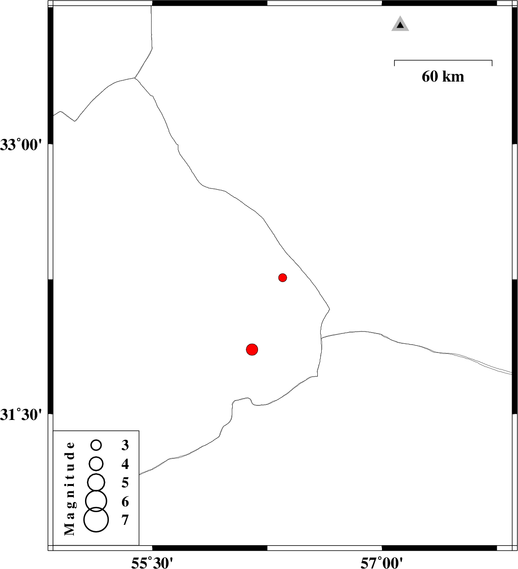 | 2013/02/06 | 17:43:02.1 | 21:13:02.1 | 31.86 | 56.15 | 14 | ML3.4 | Yazd Province, 77 km North-East of Bafq |