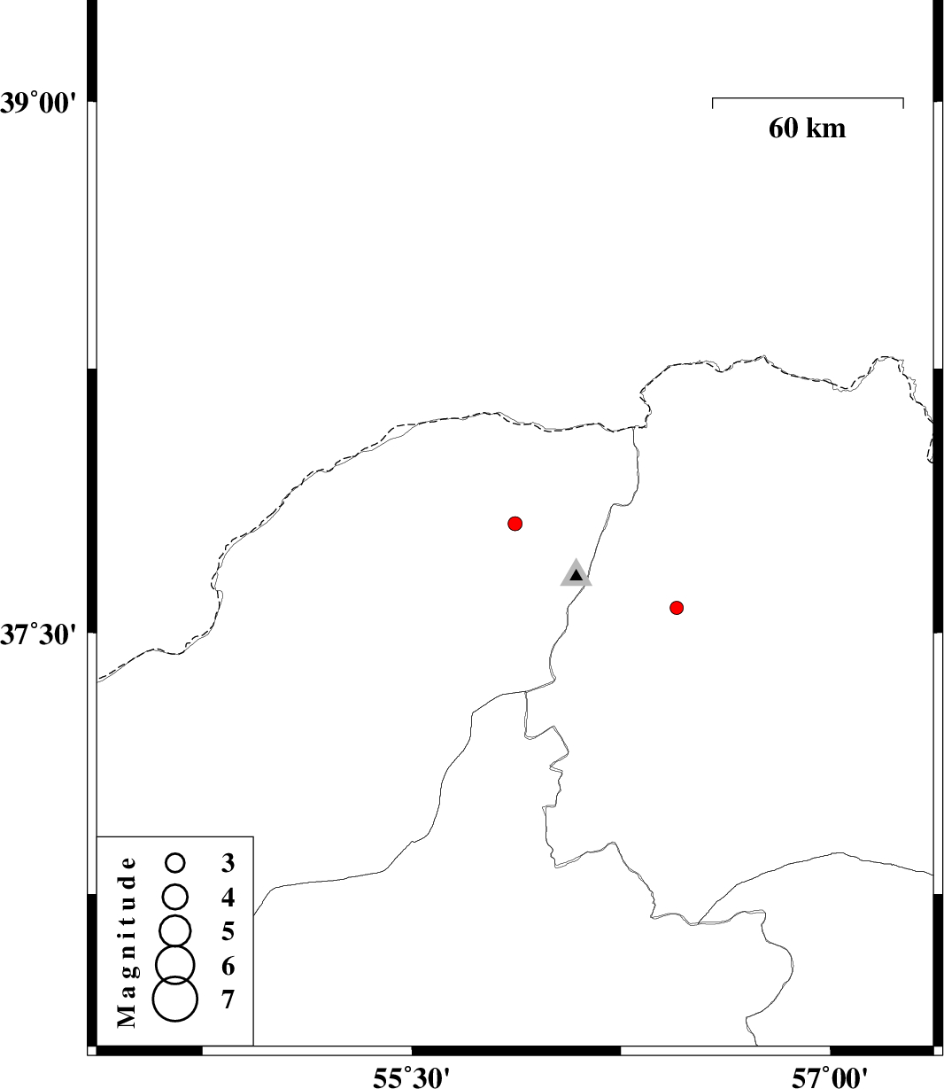 | 2013/02/11 | 22:58:55.6 | 02:28:55.6 | 37.81 | 55.87 | 14 | ML2.3 | Golestan Province, 58 km North-East of Kalaleh | ||