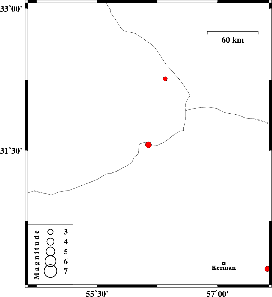 | 2013/02/10 | 01:56:27.8 | 05:26:27.8 | 30.23 | 57.62 | 18 | ML2.9 | Kerman Province, 52 km East of Kerman |