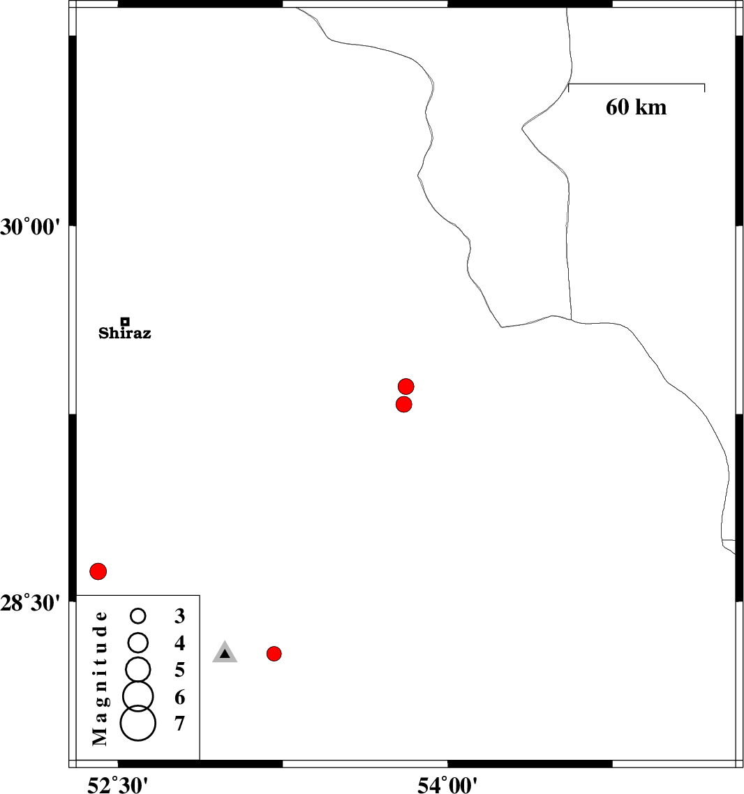| 2013/02/15 | 10:04:31.5 | 13:34:31.5 | 28.62 | 52.41 | 6 | ML3.4 | Fars Province, 30 km South-West of Firuz Abad |