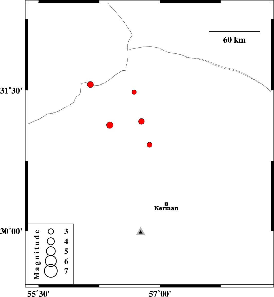 | 2013/02/19 | 00:03:50.5 | 03:33:50.5 | 30.92 | 56.87 | 14 | ML2.8 | Kerman Province, 39 km South of Ravar | ||