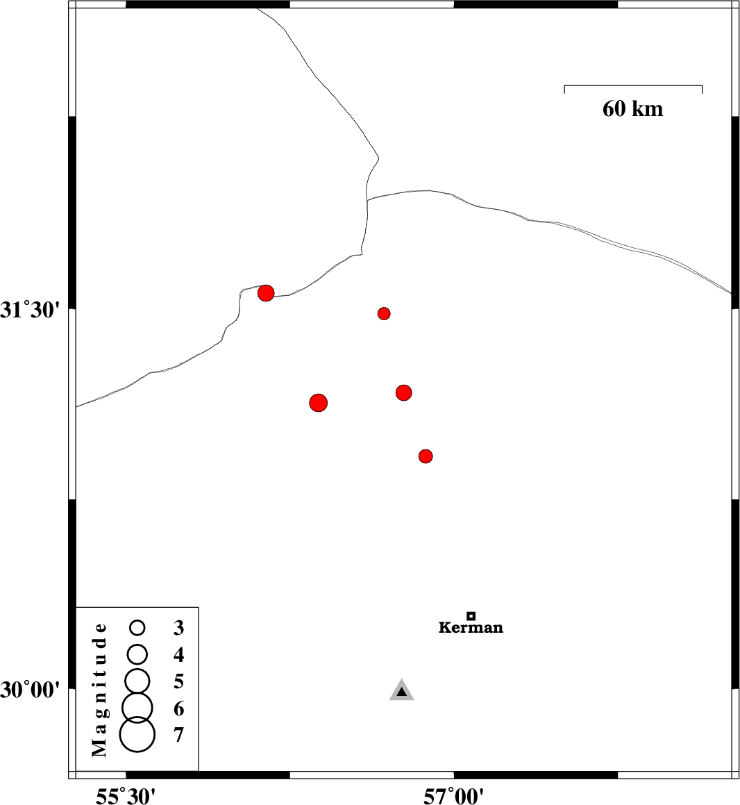| 2013/02/19 | 00:03:50.5 | 03:33:50.5 | 30.92 | 56.87 | 14 | ML2.8 | Kerman Province, 39 km South of Ravar | ||