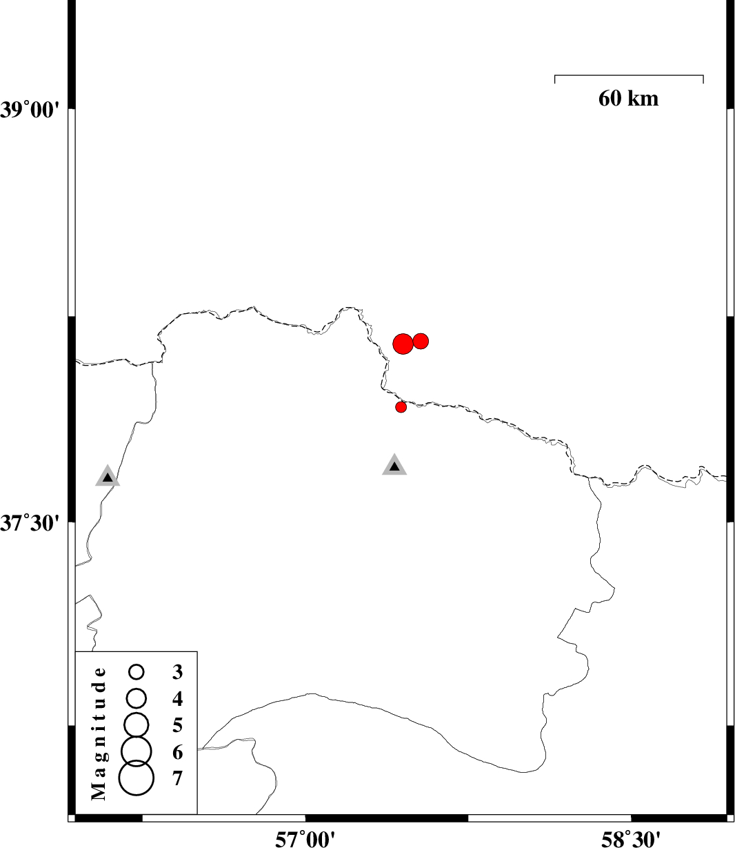 | 2013/03/02 | 00:32:59.9 | 04:02:59.9 | 37.92 | 57.44 | 23 | ML2.2 | Khorasan(north) Province, 50 km North-East of Bojnurd | ||