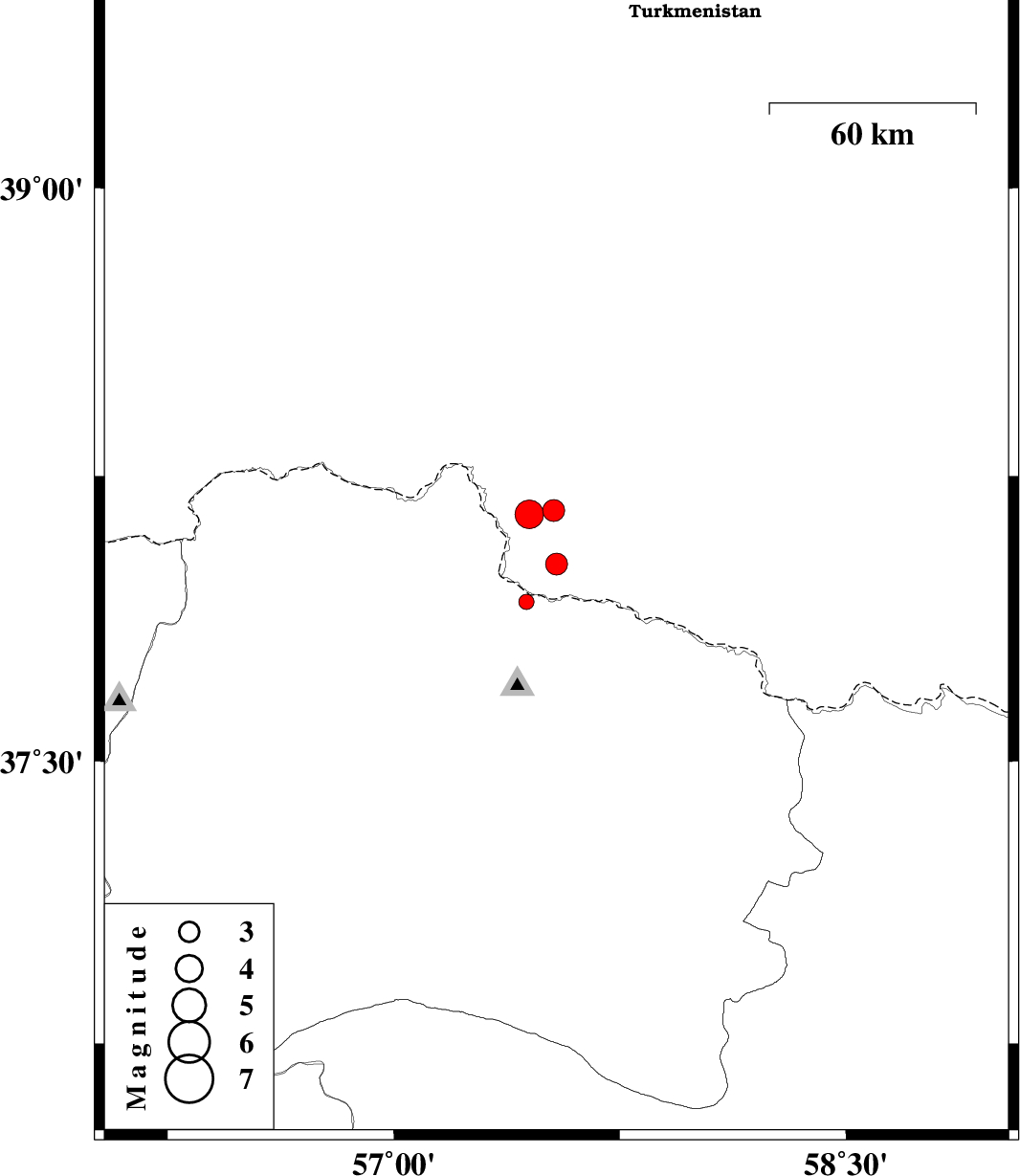 | 2013/02/28 | 11:06:02.4 | 14:36:02.4 | 38.15 | 57.45 | 16 | ML4.2 | 76 km North-East of Bojnurd |