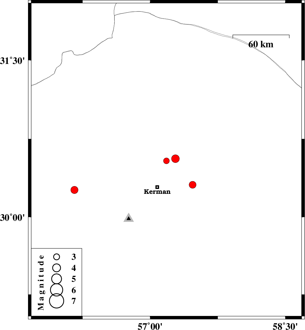 | 2013/03/03 | 16:11:13.8 | 19:41:13.8 | 30.56 | 57.28 | 14 | ML3.9 | Kerman Province, 36 km North-East of Kerman | ||