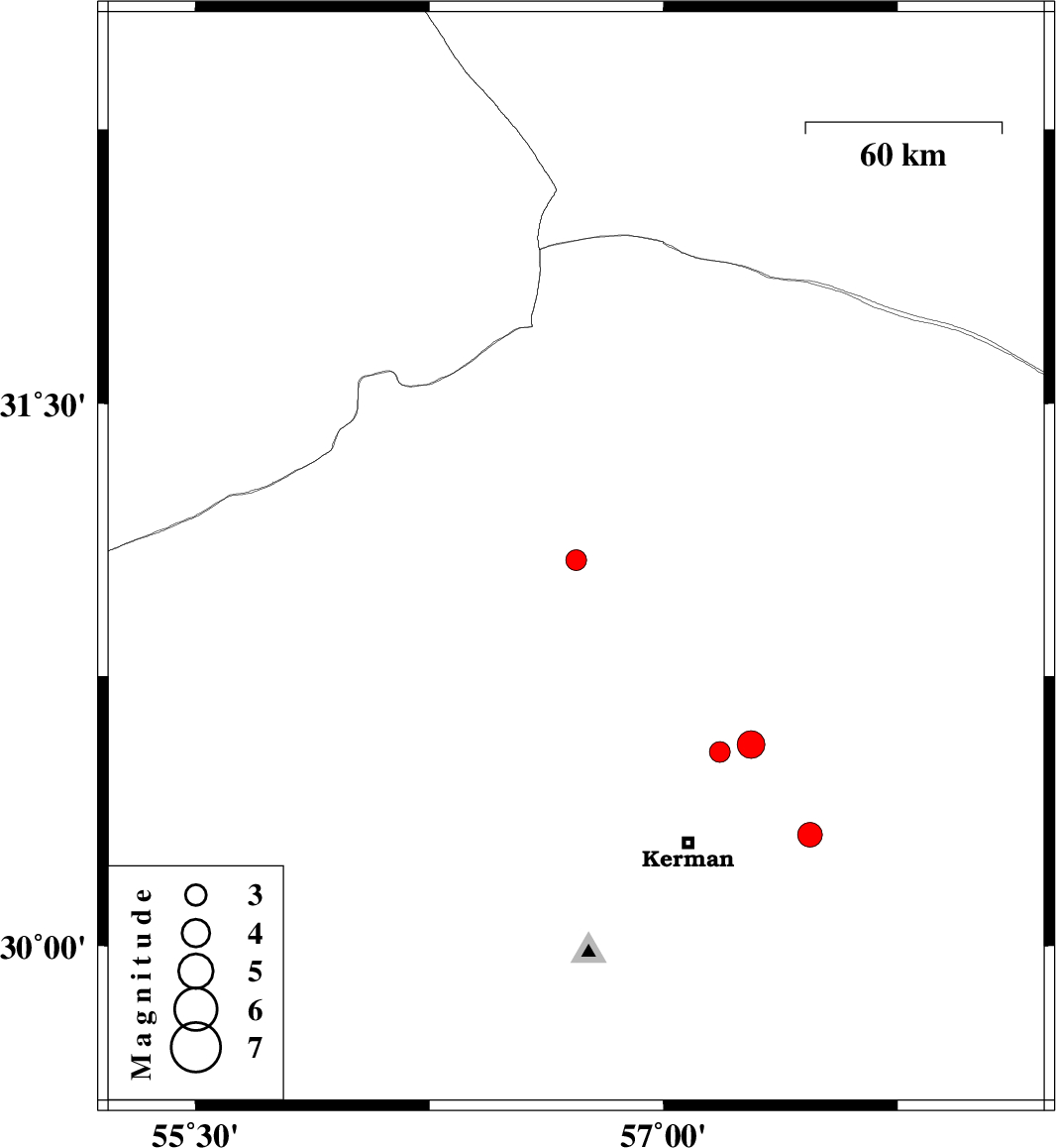 | 2013/03/06 | 19:29:19.1 | 22:59:19.1 | 31.07 | 56.72 | 18 | ML2.9 | Kerman Province, 24 km South of Ravar | ||