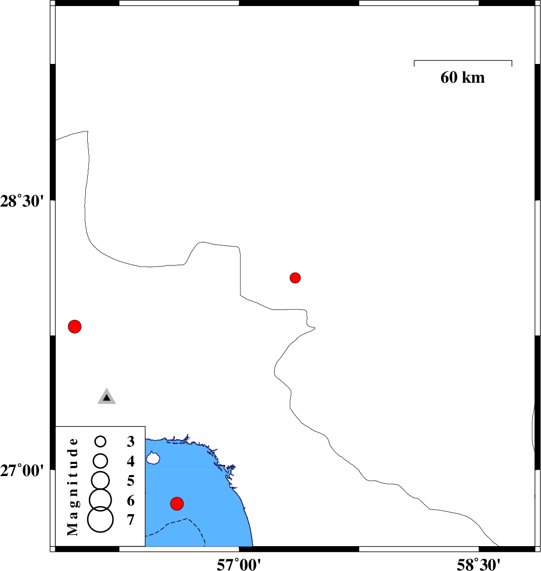 | 2013/03/21 | 06:16:01.6 | 09:46:01.6 | 28.07 | 57.35 | 14 | ML2.9 | Kerman Province, 36 km North-West of Kahnuj | ||
