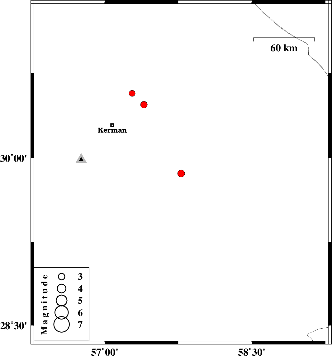 | 2013/03/19 | 17:39:53.5 | 21:09:53.5 | 30.47 | 57.4 | 18 | ML3.1 | Kerman Province, 37 km North-East of Kerman |