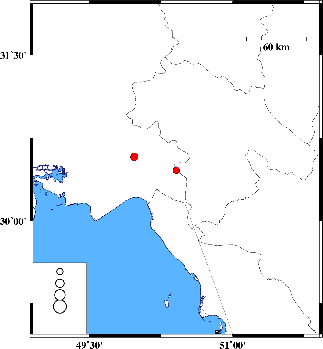 | 2013/03/21 | 17:45:12.7 | 21:15:12.7 | 30.58 | 49.97 | 27 | ML3.6 | Khoozestan Province, 26 km West of Behbahan |