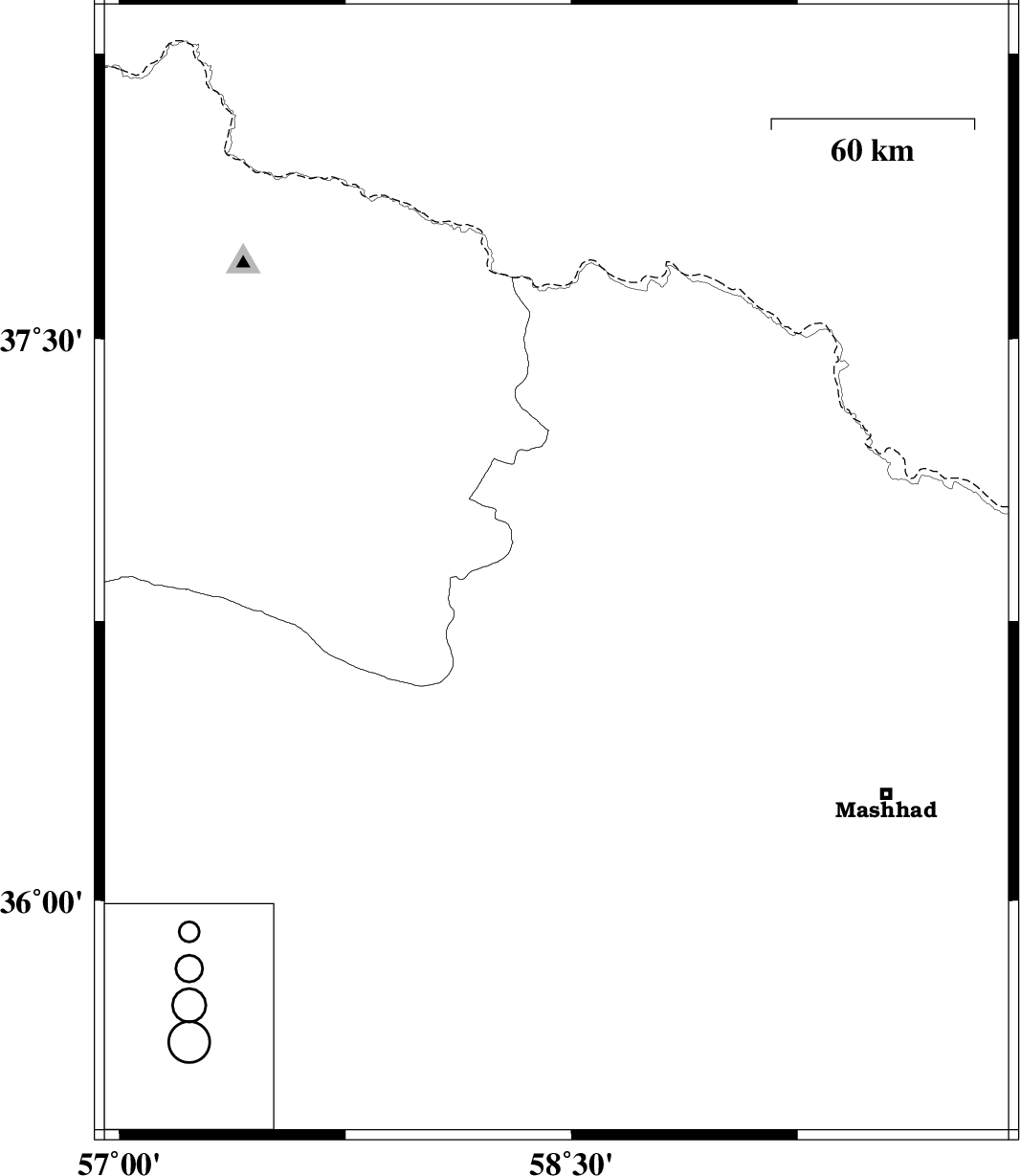 | 2013/03/30 | 23:18:17.6 | 03:48:17.6 | 36.88 | 58.45 | 18 | ML2.5 | Khorasan(center) Province, 26 km South of Quchan |