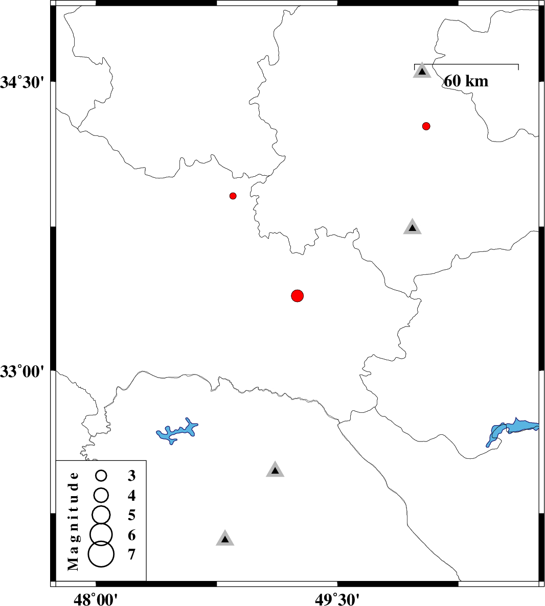 | 2013/04/04 | 15:55:13.2 | 20:25:13.2 | 33.39 | 49.25 | 14 | ML3.4 | Lorestan Province, 20 km East of Dorud | ||