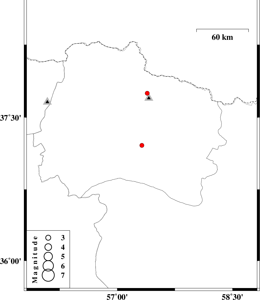 | 2013/04/10 | 05:53:59.6 | 10:23:59.6 | 37.75 | 57.39 | 15 | ML2.6 | Khorasan(north) Province, 32 km North of Bojnurd |
