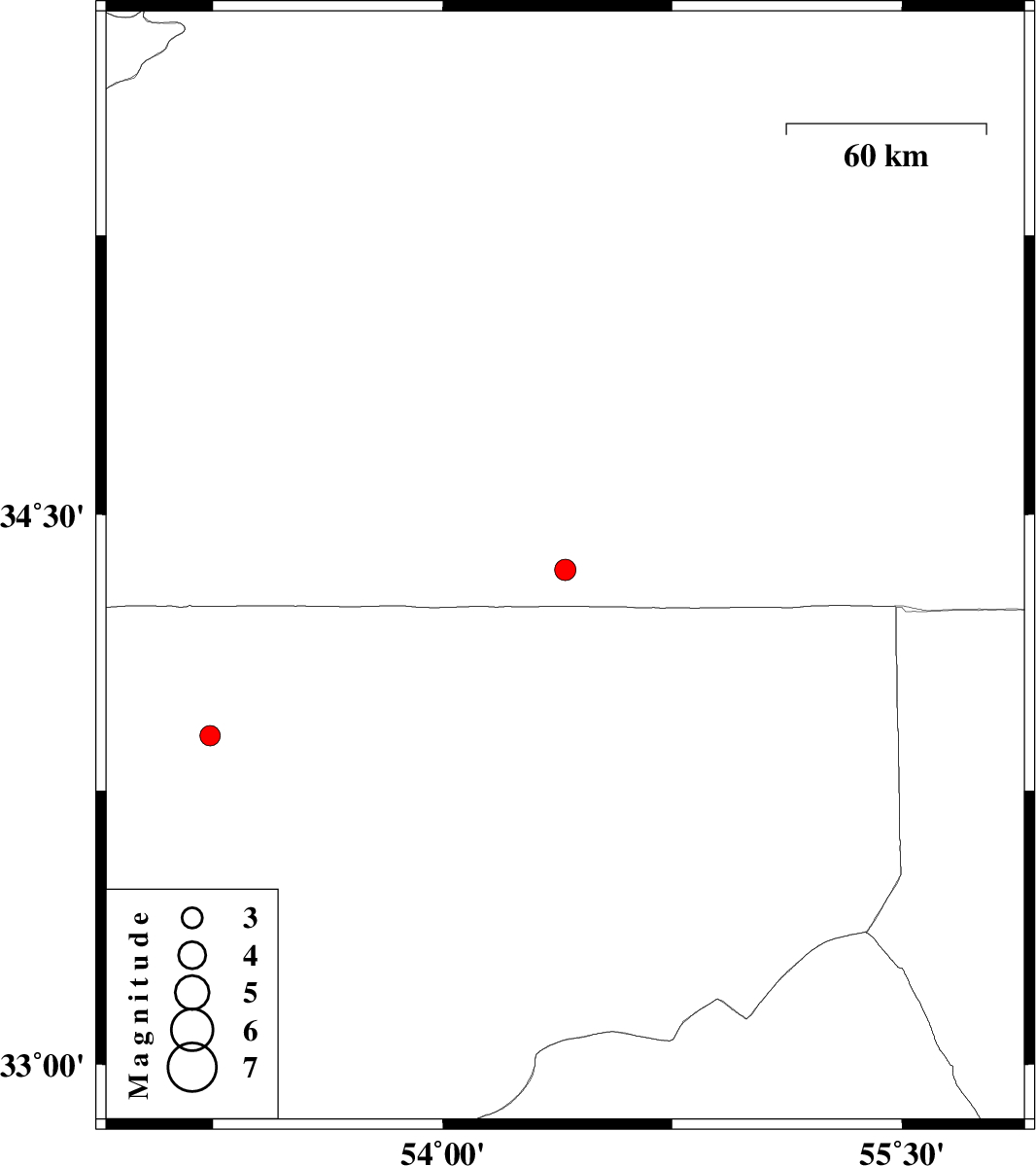 | 2013/04/10 | 04:01:41.6 | 08:31:41.6 | 33.9 | 53.24 | 14 | ML3 | Esfahan Province, 116 km North-East of Nain |