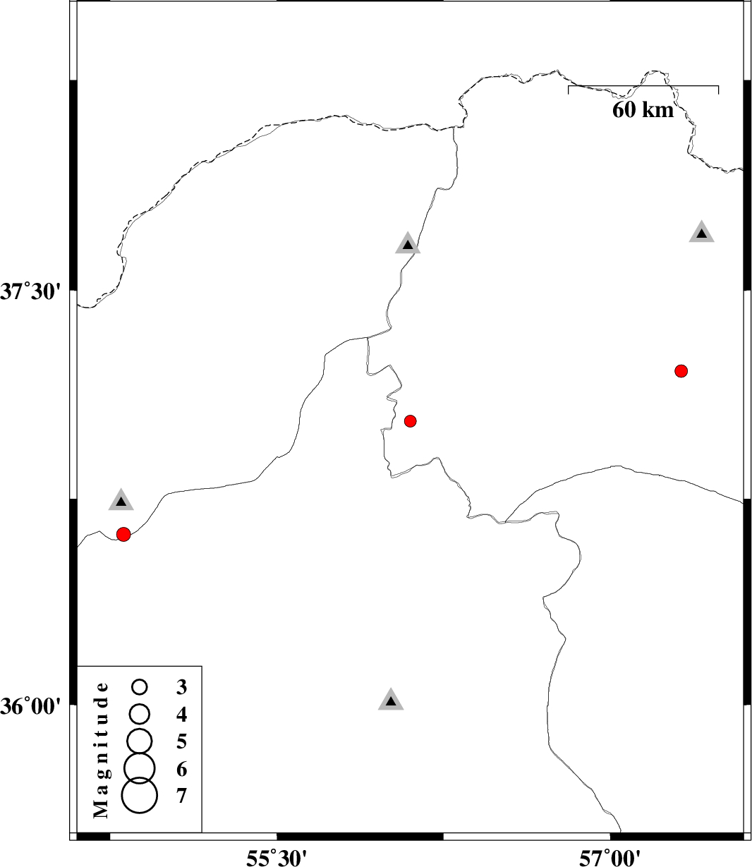 | 2013/04/14 | 14:04:30.8 | 18:34:30.8 | 36.62 | 54.81 | 14 | ML2.8 | Golestan Province, 33 km South of Ali Abad |