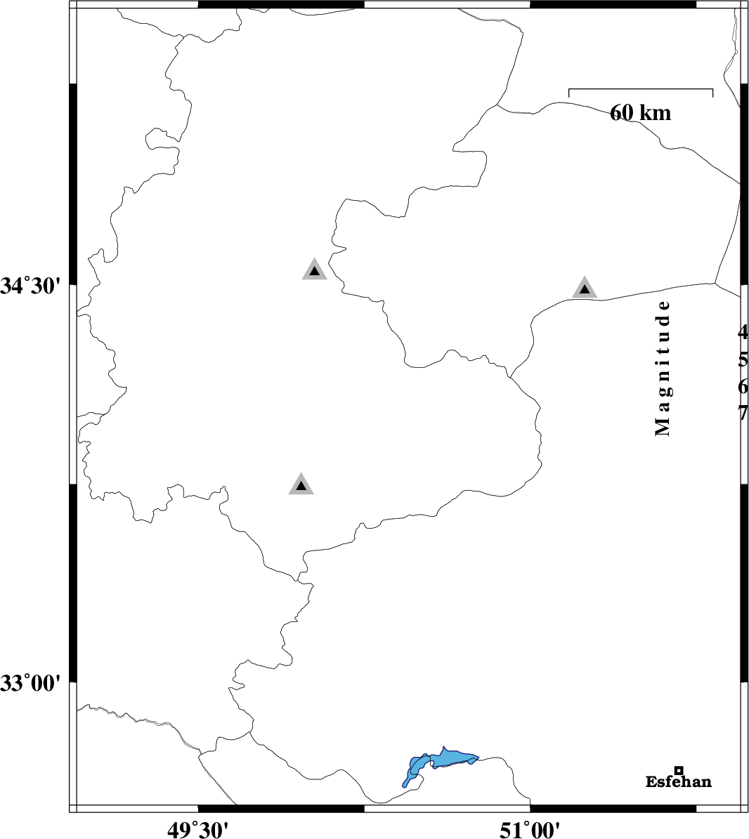 | 2013/04/19 | 20:22:34.6 | 00:52:34.6 | 32.78 | 51.71 | 14 | ML4 | Esfahan Province, 13 km North of Esfahan | ||
