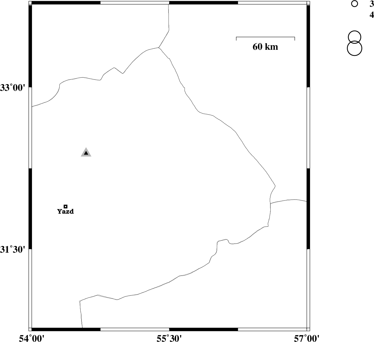 | 2013/04/22 | 12:14:28.9 | 16:44:28.9 | 32.26 | 55.5 | 14 | ML1.8 | Yazd Province, 73 km North-East of Bafq | ||