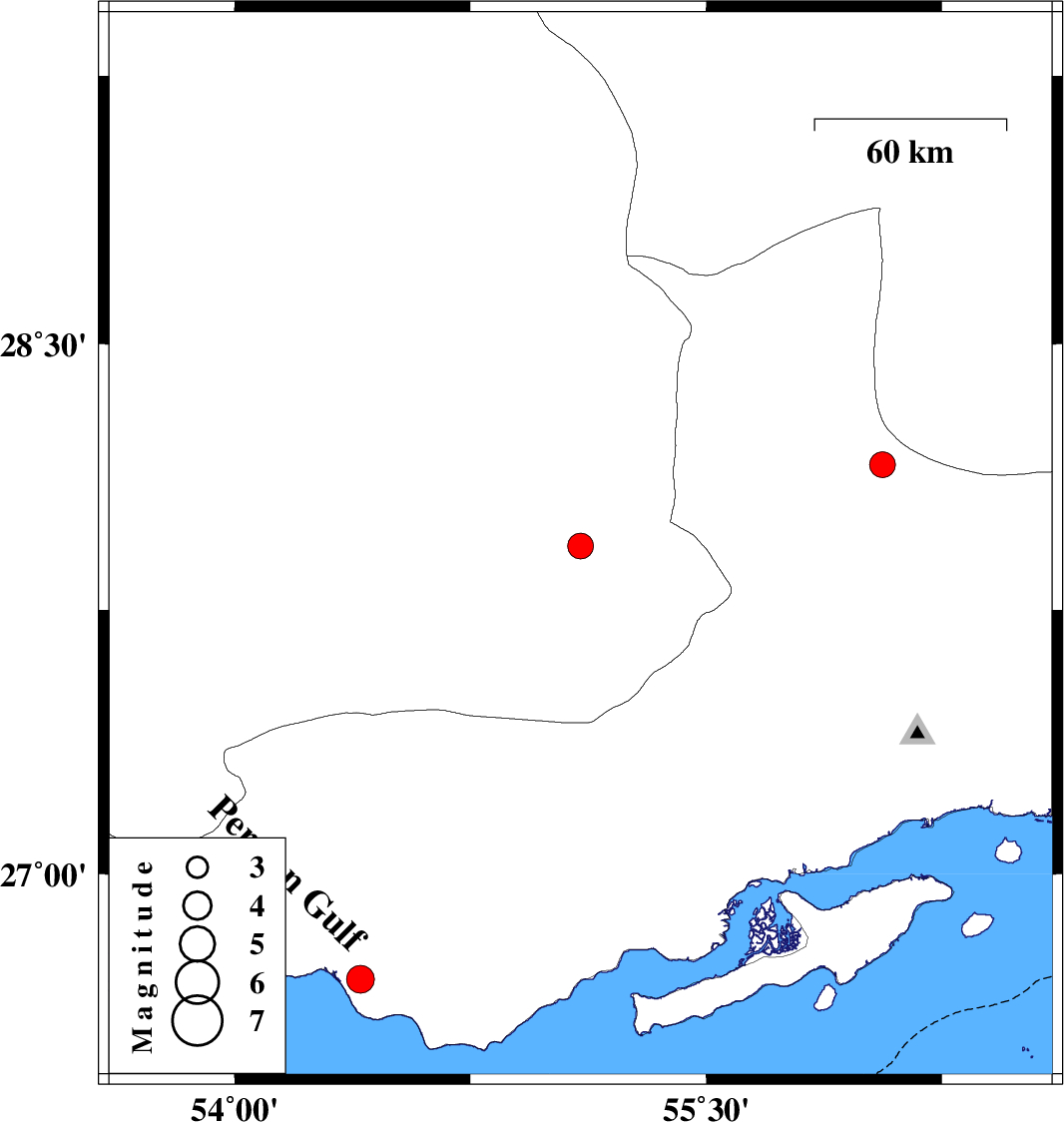 | 2013/04/19 | 21:41:05.3 | 02:11:05.3 | 26.99 | 53.94 | 34 | ML5 | Hormozgan Province, 48 km South-West of Bastak | ||