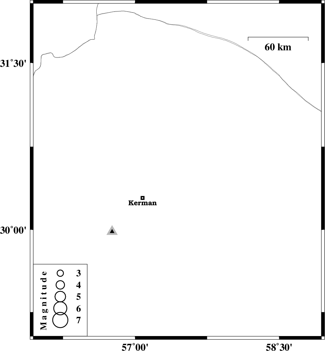 | 2013/04/27 | 03:22:20.5 | 07:52:20.5 | 30.53 | 57.44 | 16 | ML2.9 | Kerman Province, 44 km North-East of Kerman |