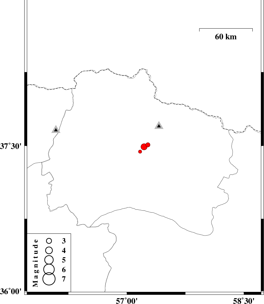 | 2013/04/30 | 02:00:13.8 | 06:30:13.8 | 37.49 | 57.22 | 29 | ML3.7 | Khorasan(north) Province, 10 km West of Bojnurd |