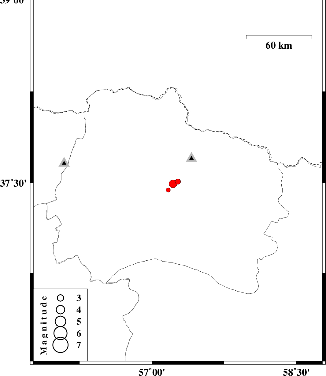 | 2013/04/30 | 02:00:13.8 | 06:30:13.8 | 37.49 | 57.22 | 29 | ML3.7 | Khorasan(north) Province, 10 km West of Bojnurd |
