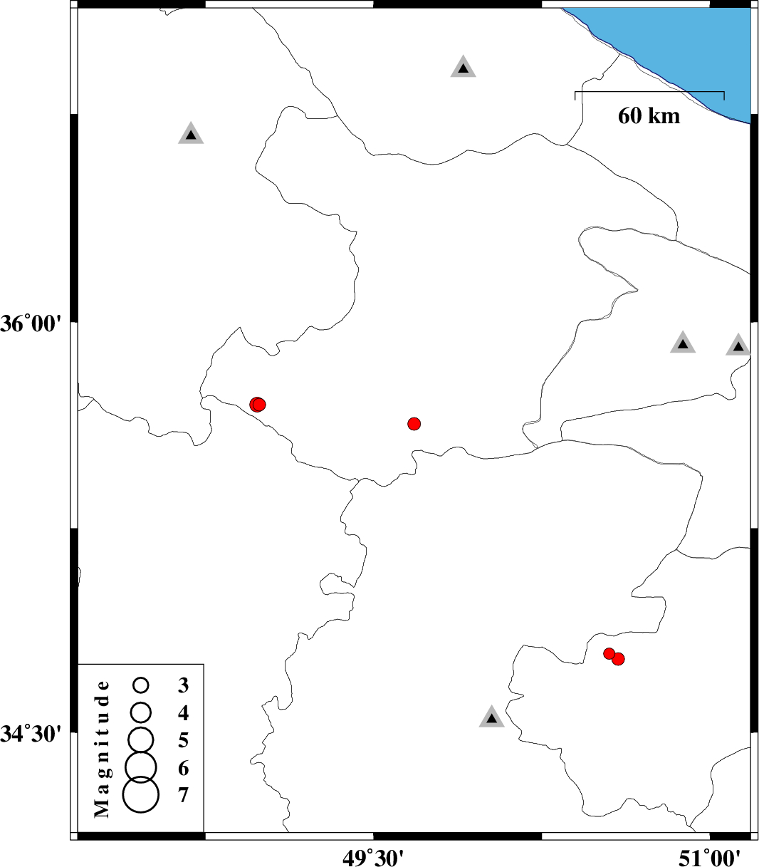 | 2013/04/29 | 05:56:04.8 | 10:26:04.8 | 35.7 | 48.98 | 14 | ML2.9 | Ghazvin Province, 36 km North of Razan |