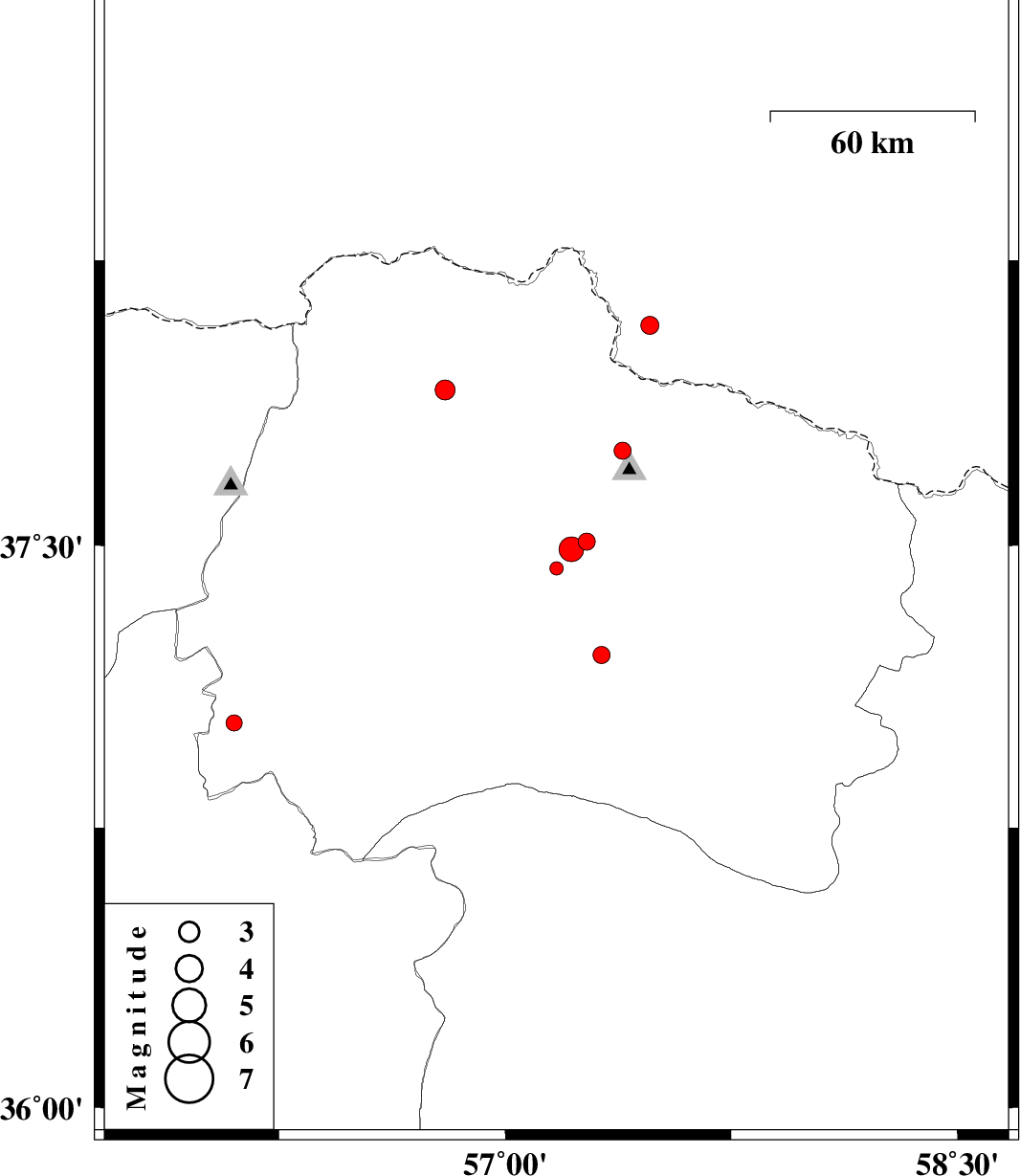 2013/04/08 01:10:40.5 05:40:40.5 38.0857.4815 ML2.7 69 km North-East of Bojnurd