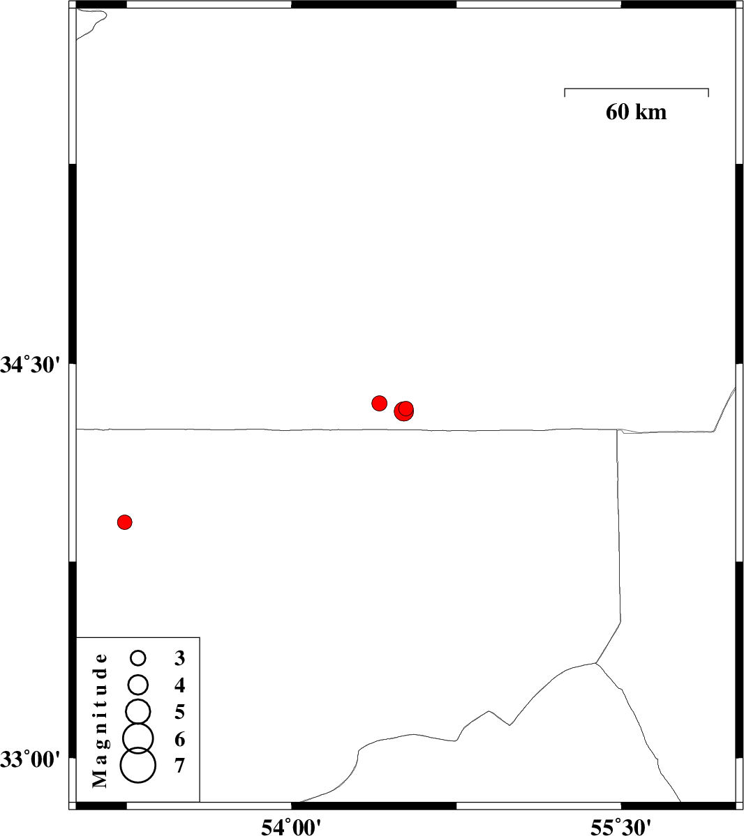 | 2013/04/10 | 04:01:41.6 | 08:31:41.6 | 33.9 | 53.24 | 14 | ML3 | Esfahan Province, 116 km North-East of Nain |