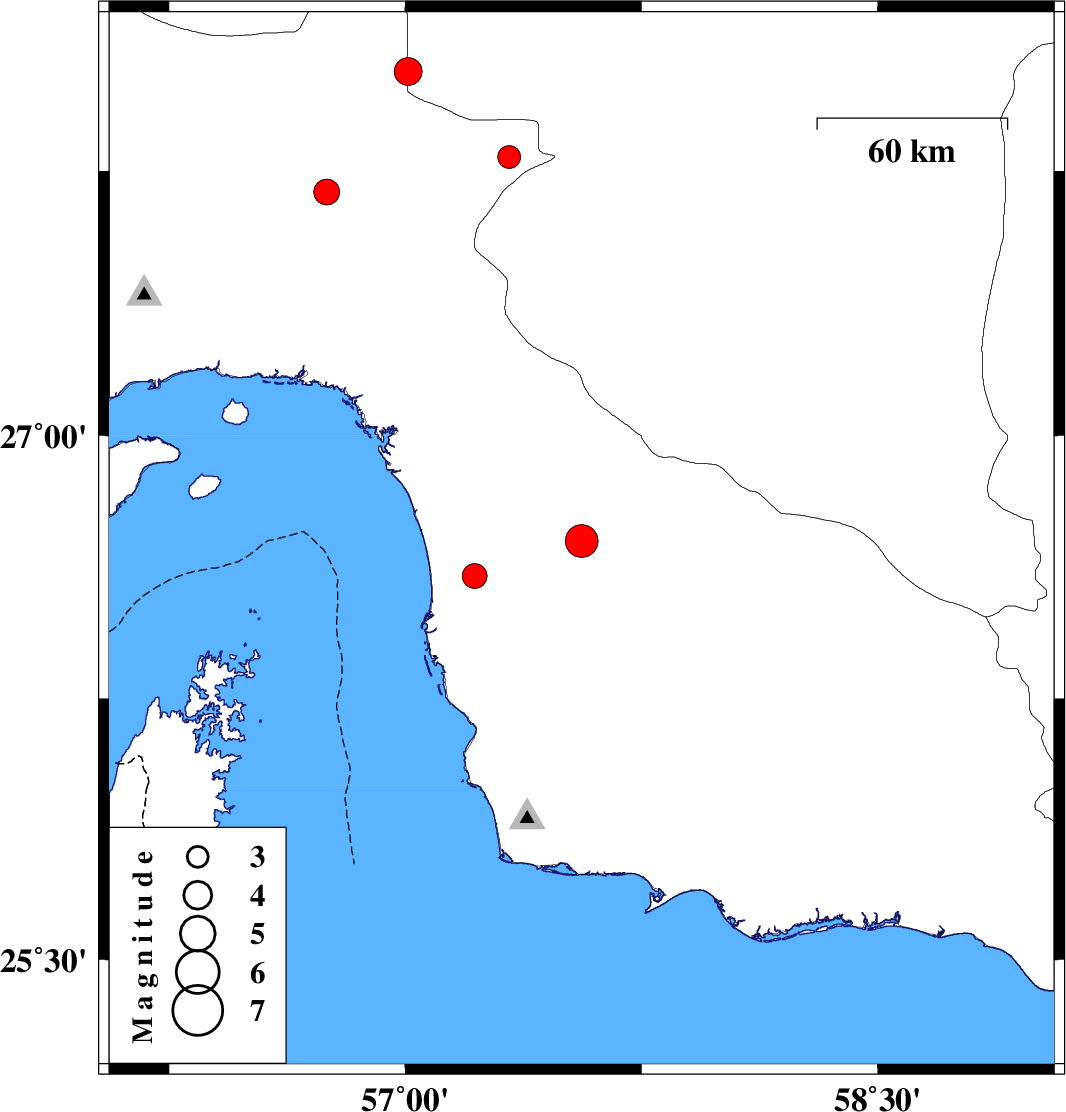 2013/05/09 08:01:32.8 12:31:32.8 26.757.5615 ML4.7 Hormozgan Province, 79 km South of Manujan