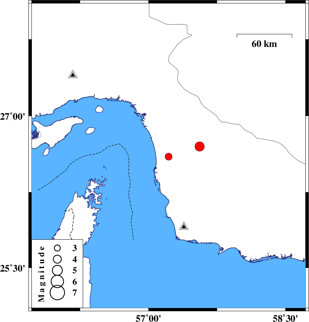 | 2013/05/09 | 08:01:32.8 | 12:31:32.8 | 26.7 | 57.56 | 15 | ML4.7 | Hormozgan Province, 79 km South of Manujan |