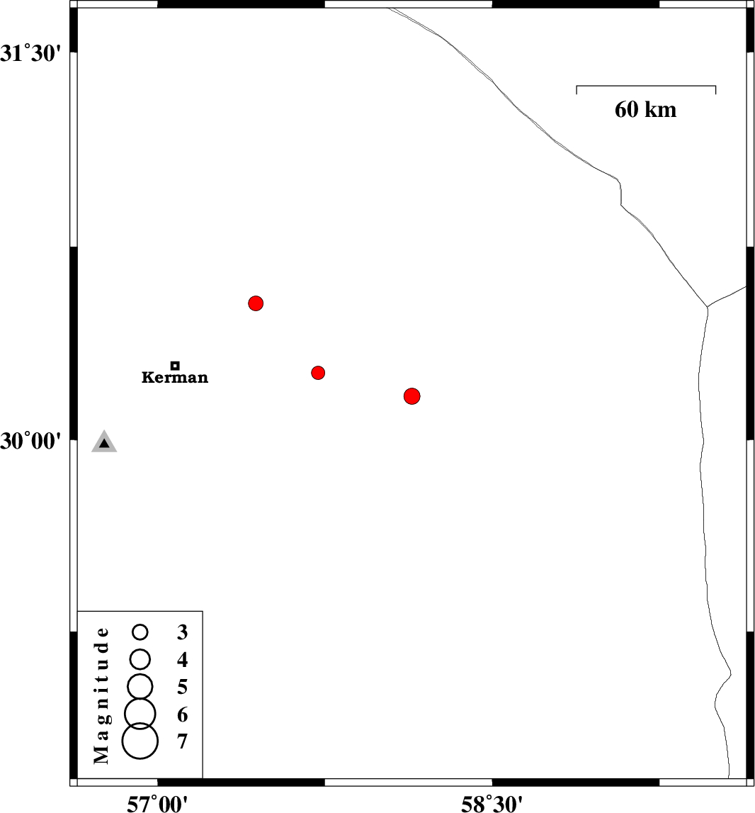 | 2013/04/19 | 22:34:41.4 | 03:04:41.4 | 30.26 | 57.72 | 14 | ML2.7 | Kerman Province, 61 km East of Kerman |