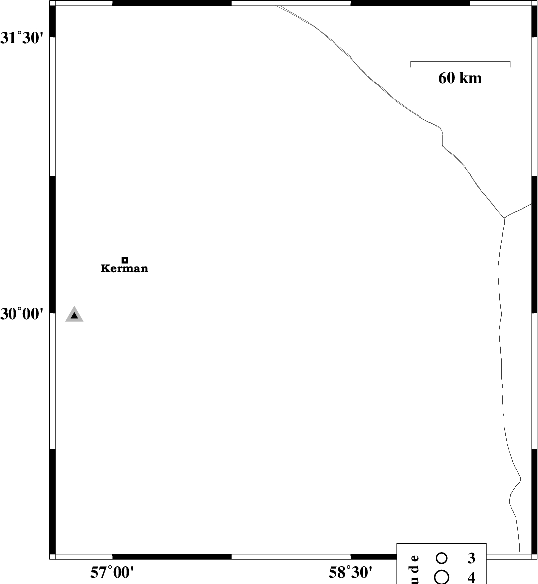 | 2013/05/10 | 05:23:35.0 | 09:53:35.0 | 30.17 | 58.14 | 18 | ML3.2 | Kerman Province, 103 km South-East of Kerman |