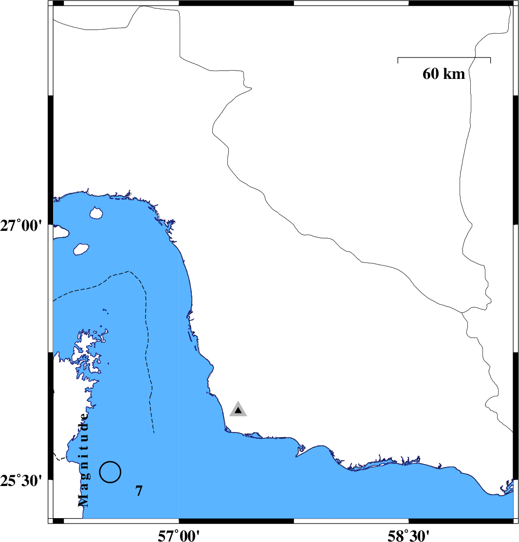 2013/05/11 03:09:48.1 07:39:48.1 26.5257.8715 Ms5.7 Hormozgan Province, 99 km North-East of Jask