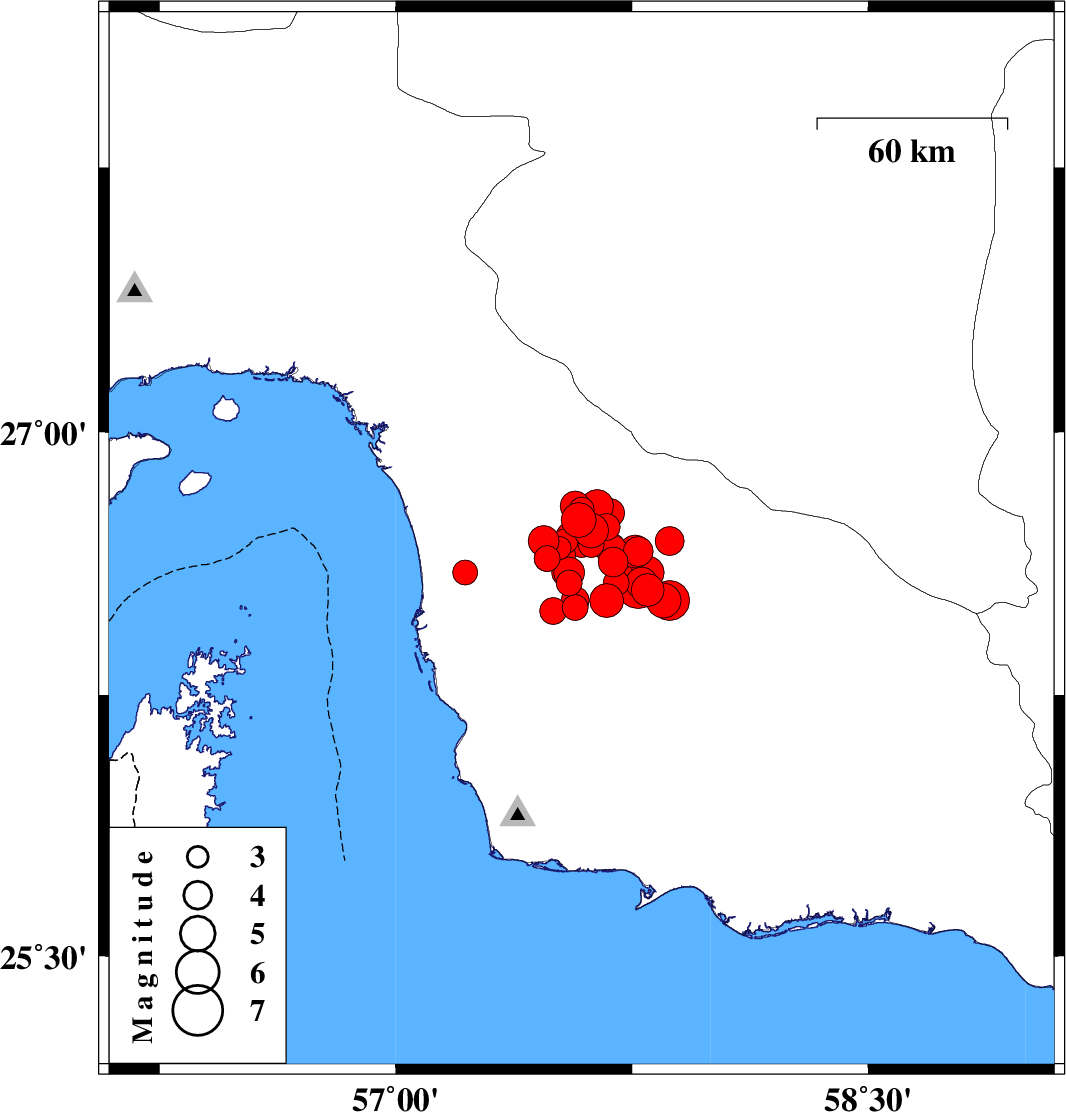 2013/05/11 02:08:08.5 06:38:08.5 26.5657.7715 Ms6.2 Hormozgan Province, 103 km North of Jask