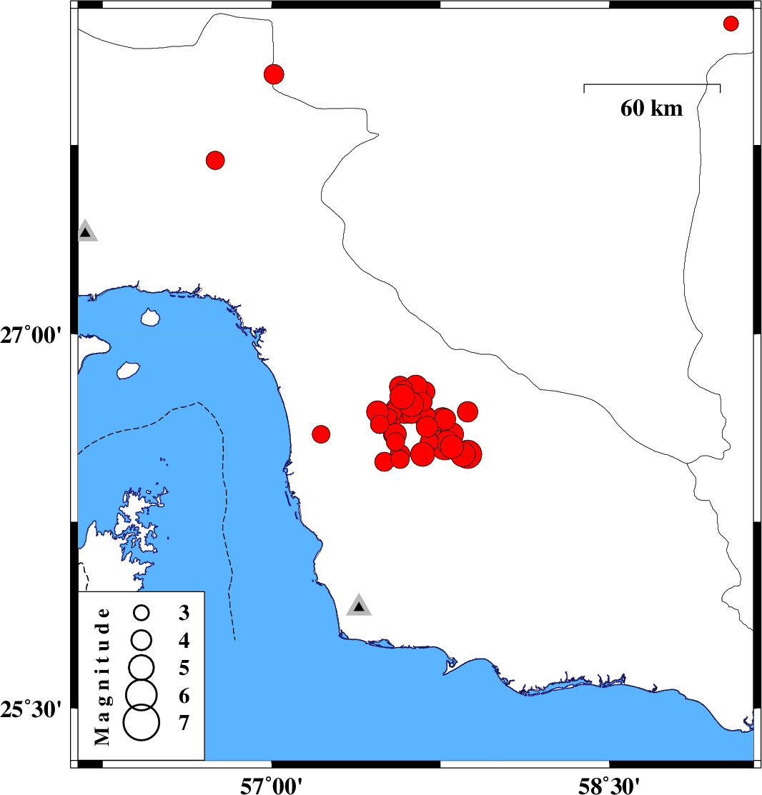 2013/05/11 02:08:08.5 06:38:08.5 26.5657.7715 Ms6.2 Hormozgan Province, 103 km North of Jask
