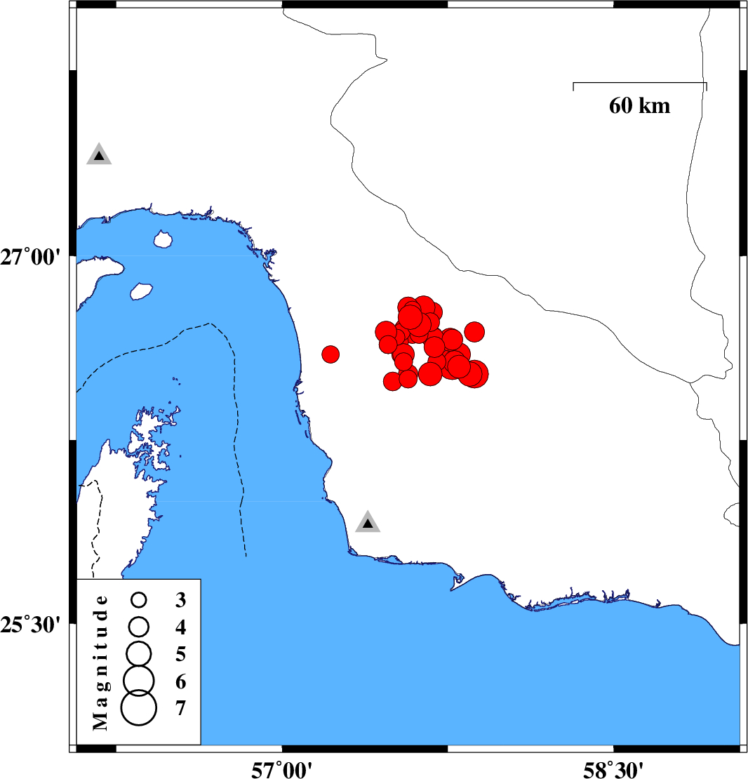 2013/05/11 02:49:34.5 07:19:34.5 26.6957.5915 ML4.7 Hormozgan Province, 80 km South of Manujan