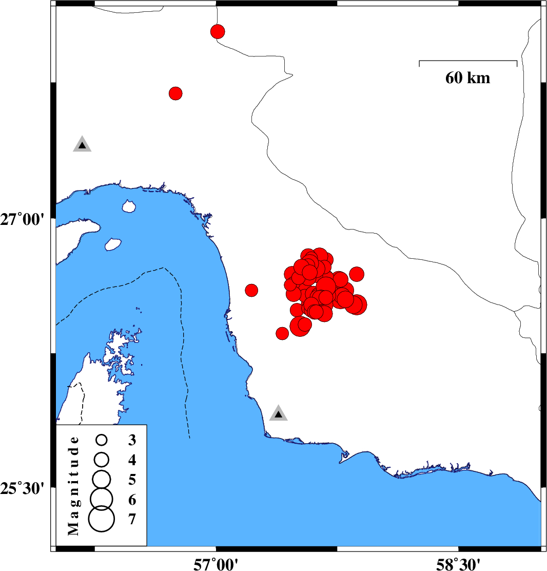 2013/05/11 02:08:08.5 06:38:08.5 26.5657.7715 Ms6.2 Hormozgan Province, 103 km North of Jask