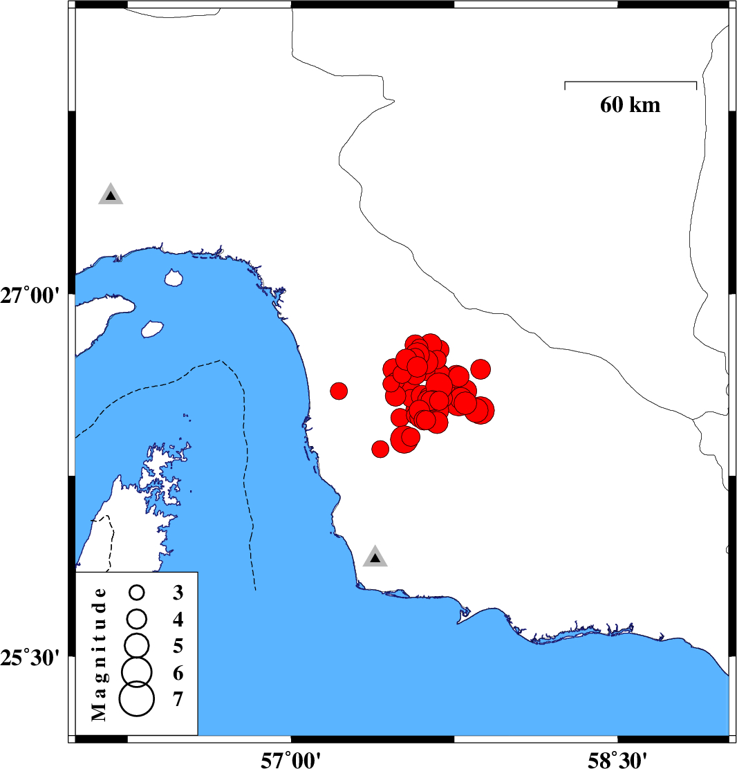 2013/05/11 02:08:08.5 06:38:08.5 26.5657.7715 Ms6.2 Hormozgan Province, 103 km North of Jask