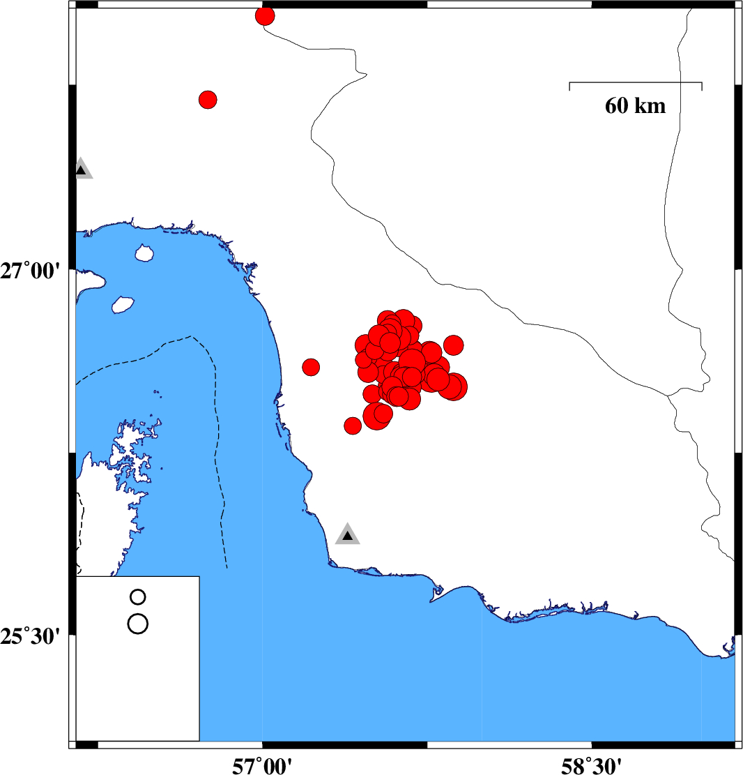 2013/05/11 02:08:08.5 06:38:08.5 26.5657.7715 Ms6.2 Hormozgan Province, 103 km North of Jask