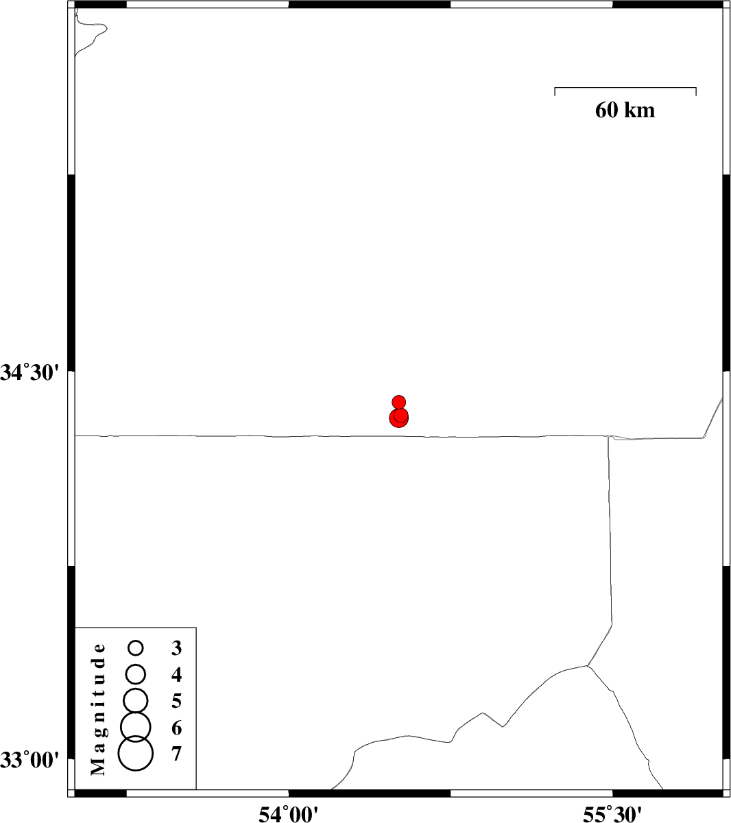 | 2013/05/07 | 20:23:00.3 | 00:53:00.3 | 34.32 | 54.51 | 14 | ML4 | Semnan Province, 206 km South-East of Damghan |
