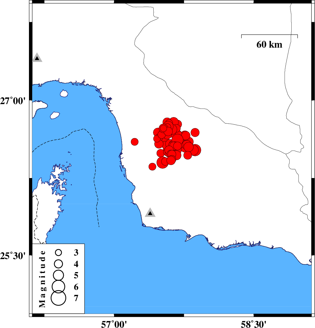 2013/05/11 22:28:08.5 02:58:08.5 26.6957.4714 ML4.4 Hormozgan Province, 80 km South of Manujan