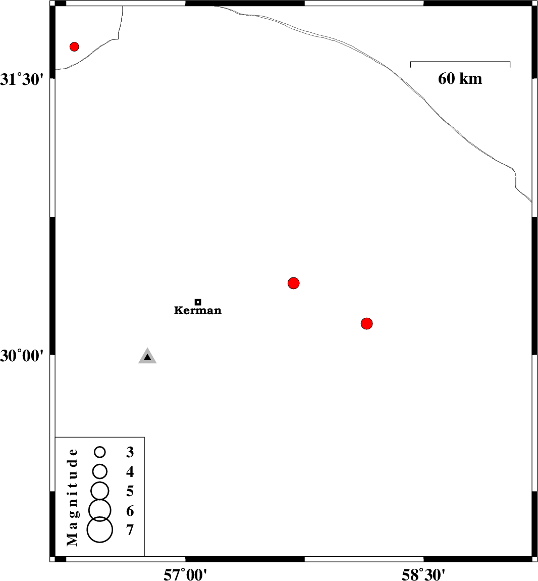 | 2013/05/13 | 20:36:59.5 | 01:06:59.5 | 30.39 | 57.68 | 15 | ML3.2 | Kerman Province, 59 km East of Kerman | ||